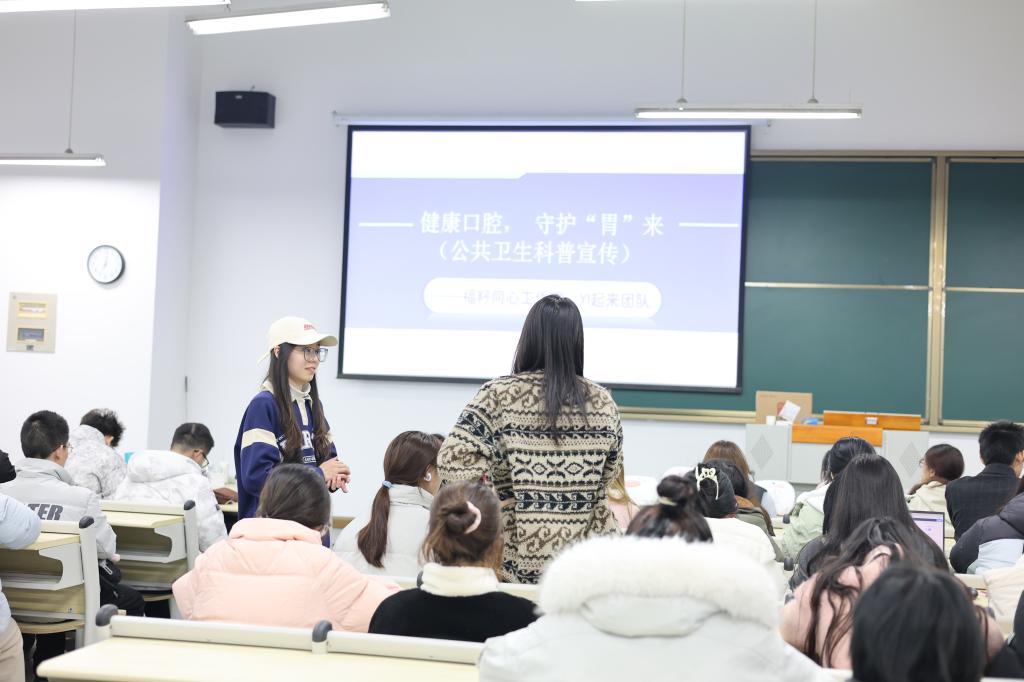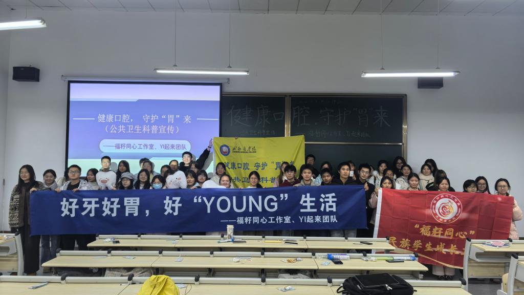 12月2日晚,成都医学院“福籽同心工作室”联合“YI来团队”在教学楼开展了以“健康口腔,守护‘胃’来”为主题的公共卫生科普宣传活动。近60名学生通过知识讲解、实操检测和互动问答等形式,深入学习了口腔与胃部健康的关联知识。